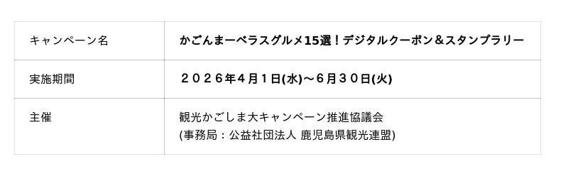 観光かごしま大キャンペーン推進協議会(会長:塩田 康一・鹿児島県知事)は、JR九州新幹線全線開業15周年を記念した特別企画として、九州新幹線や県内ローカル線を利用してご当地グルメを楽しんでもらうため、県内の91店舗が参加する「かごんまーベラスグルメ15選!デジタルクーポン&スタンプラリー」を、2026年4月1日(水)より開催します。