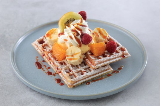 お店で焼き上げたサクサクのワッフルに、なめらかなカスタードクリーム、バニラアイス、ホイップクリームを添えました。オレンジ、バナナ、キウイ、フランボワーズをちりばめ、ビターなカラメルソースで仕上げた、プリンアラモードのような贅沢な一皿です。
