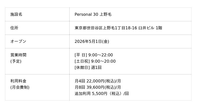 コナミスポーツ株式会社(以下、「弊社」)は、パーソナルトレーニングジム「Personal 30」の4店舗目を2026年5月1日(金)に上野毛(東京都世田谷区)にオープンします。