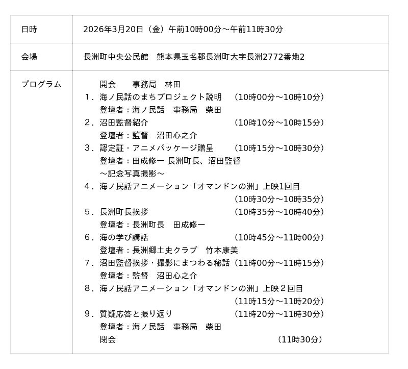 一般社団法人日本昔ばなし協会が取り組む「海ノ民話のまちプロジェクト」は、3月20日(金)に長洲町中央公民館で「オマンドンの洲」の完成記念上映会とあわせ沼田監督からの海ノ民話のまちの認定証の交付式を実施いたしました。
