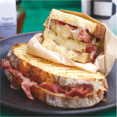 従来のお昼時に合わせて用意しているサンドイッチとは別に、購入後に店舗のパニーニクッカーでプレス焼きをしてからご提供いたします。B²自慢のカンパーニュに、様々な具材を挟んだサンドイッチは、パン生地の味わいもしっかり感じられるよう、挟む具材はなるべくシンプルに。いそがしいランチタイムでもクイックに楽しめる一品です。