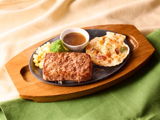 つなぎなしビーフ100%のビーフハンバーグステーキと、北海道産帆立を使ったグラタンを一緒にご提供します。