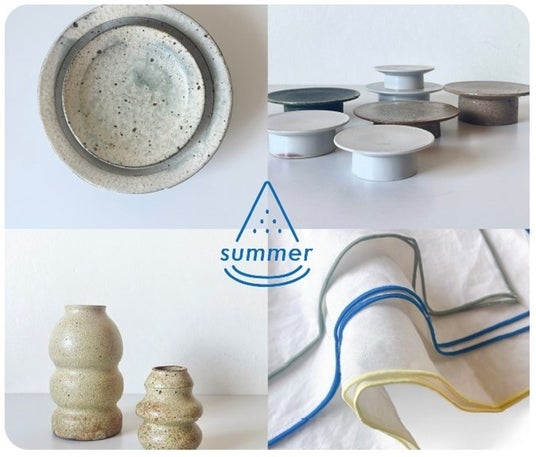 「器屋summer」上田隆之 4寸皿 4,180円~、舛井岳二 高杯 4,400円~、庄司理恵 花器 4,620円~、オリジナルリネンキッチンクロス 4,180円