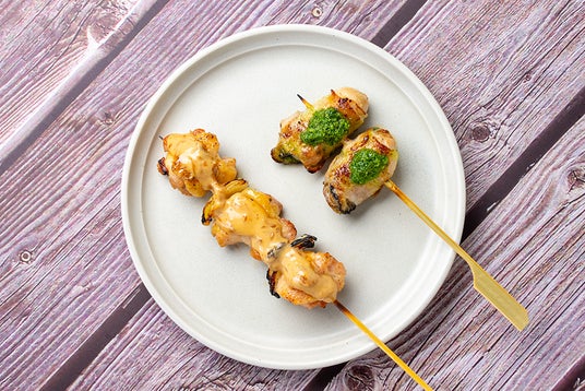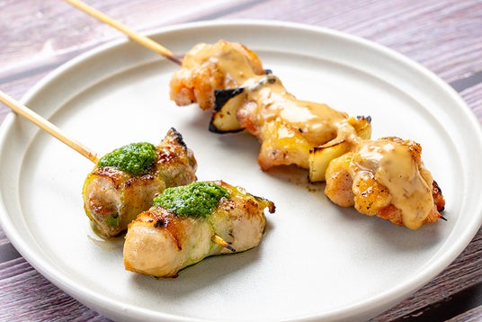 写真左:もも串 サンマヨ、写真右:牡蠣の肉巻きバジルソース