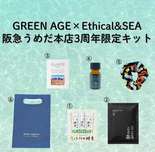 「Ethical & SEA」GREENAGE×Ethical&SEA阪急うめだ本店3周年限定キット(青パパイヤ酵素 〈3g×3包〉、BeエッセンスシートマスクC〈1枚〉、 CLAYD ONETIMEマルラオイル〈10ml〉、限定シュシュ、トートバッグ) 4,400円[限定5] ※5,700円相当 ※5セット完売後はオリジナルショッパー入りを販売 [限定15]【阪急うめだ本店限定】