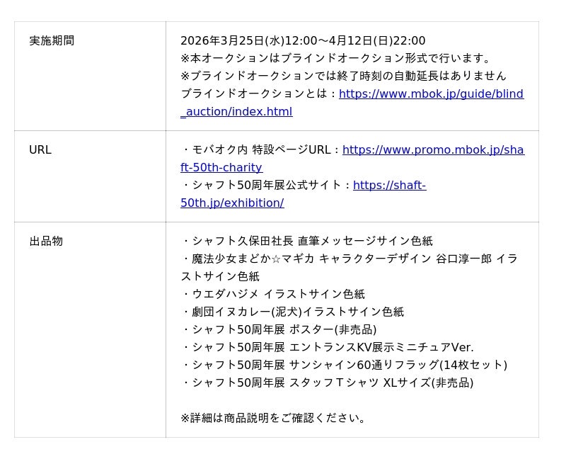 【「シャフト50年の軌跡と未来」~アニメ制作会社シャフトの歴史と魅力を込めたチャリティーオークションを開催!~ 概要】