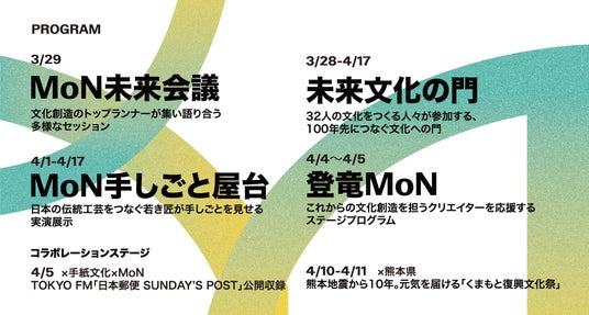 開館当日の3月28日(土)から4月17日(金)の21日間、開館記念イベント「MoN祭(モンフェス)」を開催いたします。本イベントは、「100年先に文化をつなぐ」をミッションとするMoN Takanawaに多様な文化人が集い、あらゆる文化を讃え、文化がはじまる瞬間を喜ぶ、21日間にわたる「文化の祝祭」です。多様な文化の担い手が集い、展示、パフォーマンス、プレゼンテーションなど、多彩な表現を通じてMoN Takanawaの開館を祝い、盛り上げます。