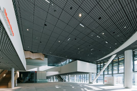 印象的でシンボリックなスパイラル状の建物は、隈研吾建築都市設計事務所による外装デザイン。木材をふんだんに用い、緑に覆われた外観が屋内外をシームレスにつなぎます。植栽の多くは日本の在来種で構成され、季節の移ろいを感じさせます。