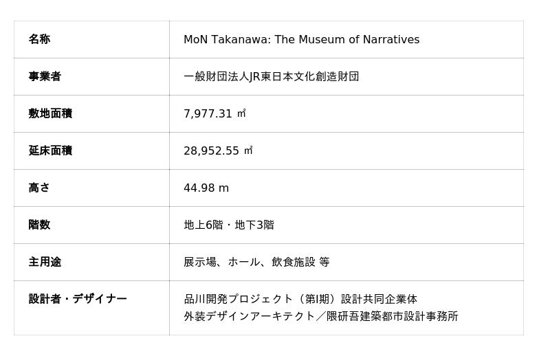 一般財団法人JR東日本文化創造財団は、高輪ゲートウェイ駅直結・国内最大級の新たな街「TAKANAWA GATEWAY CITY」内に、地上6階地下3階の複合型ミュージアム「MoN Takanawa: The Museum of Narratives(モン タカナワ ザ ミュージアム オブ ナラティブズ、以下 MoN Takanawa)」を、2026年3月28日(土)に開館いたします。