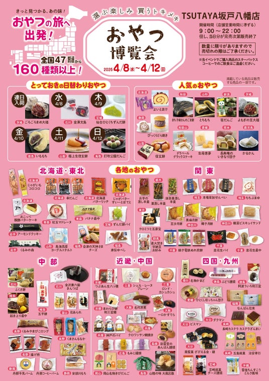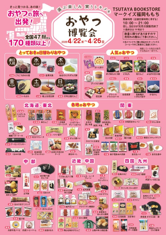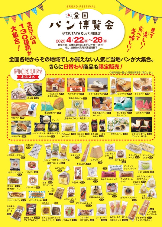 カルチュア・エクスペリエンス株式会社(本社:東京都千代田区、代表取締役社長:鎌浦 慎一郎)は、全国のご当地パンを集めたイベント『全国パン博覧会』を各地で開催しています。2026年4月は、「TSUTAYA QLuRi川越店」(埼玉川越市)で、4月22日(水)より開催いたします。また、また、全国のご当地おやつを集めたイベント『おやつ博覧会』を「TSUTAYA 坂戸八幡店」(埼玉県坂戸市)、「TSUTAYA BOOKSTORE マークイズ福岡ももち」(福岡県福岡市)で、4月8日(水)より順次開催します。