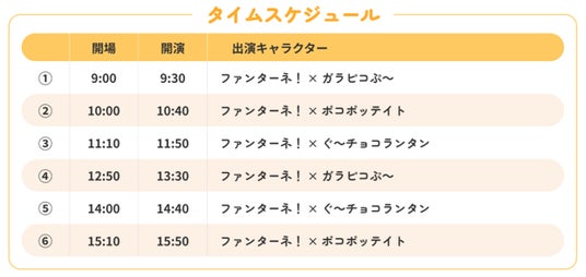 「ファンターネ!」をはじめ、「ガラピコぷ~」「ポコポッテイト」「ぐ~チョコランタン」の仲間たちも登場するオリジナルのミニステージ(約20分)を開催!キャラクターの組み合わせごとに異なるセットリストで実施します。写真撮影もOKです!