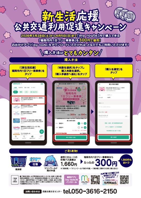 トヨタファイナンシャルサービス株式会社(本社:愛知県名古屋市、代表取締役社長:頃末 広義)が運営するおでかけアプリ「my route」は、西日本鉄道株式会社(以下、西鉄)が実施する「新生活応援キャンペーン」の対象デジタル乗車券を 、2026年3月28日(土)から4月5日(日)までの9日間限定 で販売します。