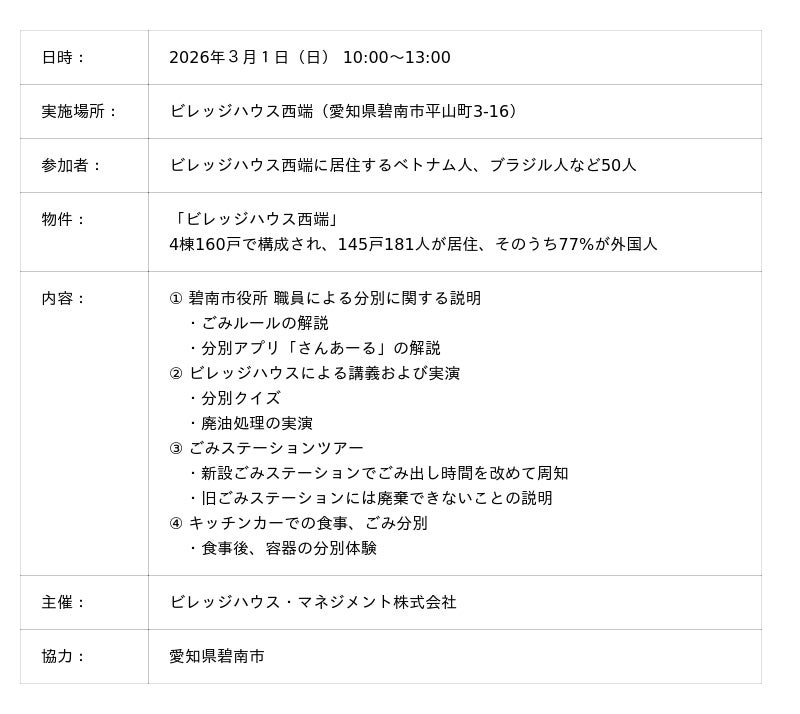 ビレッジハウス・マネジメント株式会社(本社:東京都港区、代表取締役社長兼CEO:岩元 龍彦、以下ビレッジハウス)は、2026年3月1日(日)に愛知県碧南市の「ビレッジハウス西端」で「団地deクリーンday~見て・やって学ぶ ごみの分別~」と題した、地域のごみ分別ルールを学ぶイベントを行いました。
