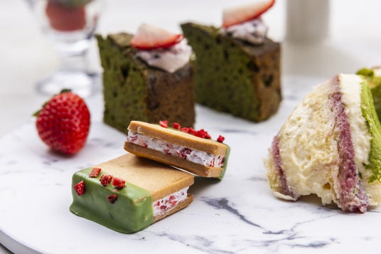 ガーデンビュッフェ「パインテラス」では、いちごとお茶をテーマにした多彩なスイーツが登場。いちごクリームをサンドし抹茶チョコをあしらったバターサンドや、緑茶とピスタチオ、いちごを組み合わせたスポンジケーキ、いちごクリーム入りの抹茶マカロンなど、和と洋が調和するラインナップをご用意しました。さらに、抹茶のバスクチーズケーキやティラミス、いちごのタルト、いちご風味の大福なども登場し、いちご×お茶の幅広い味わいをお楽しみいただけます。
