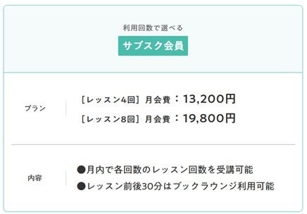 予約専用サイトより、ご希望のレッスン日時をご予約いただく完全予約制です。予約時間の1時間前までお客様ご自身で予約専用サイトからキャンセルが可能で、急な用事などが入ってしまった場合も1回分を消化することなくキャンセル対応が可能で安心です。また、通いたいペースにあわせて、月4回、月8回のプランをお選びいただけます。月の利用回数を超えてご利用されたい場合は、1回あたり3,850円をお支払いいただければ追加での受講が可能です。