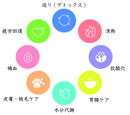 体の熱を冷ます、血管を丈夫にする、血流改善、エネルギー補給、疲労回復、栄養促進、消化に優しい、利尿作用、デトックス
