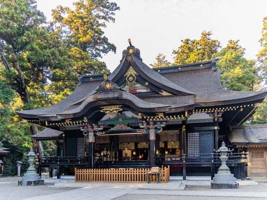深い杜に包まれた境内には凛とした静けさが漂い、黒漆を基調に極彩色をまとった社殿が、訪れる人の目を引きます。