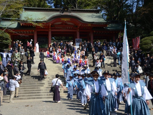 本祭の見どころは、甲冑や陣羽織などの歴史的装束をまとった氏子による大行列と、御神輿を乗せた鷁首船(御座船)による利根川での水上渡御です。
