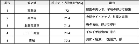 言及記事数ランキングでは清水寺・嵐山・鴨川・祇園がトップ4を占めますが、ポジティブ評価の割合で見ると、言及数がやや少ない寺社に高い満足度が集まっています。