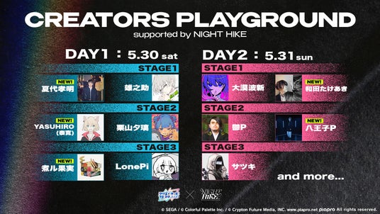 プロセカ放送局でお馴染みの、書き下ろし楽曲についてボカロPとお話する「ボカロミュージックのセカイ 出張版」と、NIGHT HIKEとコラボレーションしたDJライブステージ「CREATORS PLAYGROUND supported by NIGHT HIKE」を実施いたします。