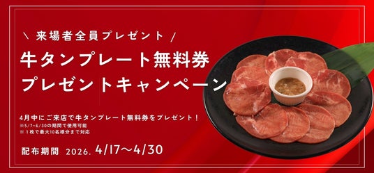 4月にご来店いただいたお客様全員に牛タンプレート無料券をプレゼント!