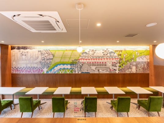 店内には、イラストレーター 山下アキ氏 が描いた阿久比町の風景をモチーフにした壁画を設置。