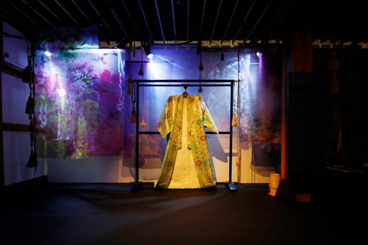 イマ―シブシアター《花宵の大茶会》は、世界的に活躍するダンスカンパニーDAZZLEと、蜷川実花 with EiMのコラボレーションによる、約70分間、来場者自身も会場を歩きながら物語に入り込む体験型公演です。会場となる北野天満宮の風月殿は、蜷川実花 with EiMが手がける色彩・光・音楽・映像で彩られた空間となっており、今回の美術鑑賞チケットでは、舞台セットを堪能・撮影できるだけではなく音楽や映像もお楽しみいただけます。イマ―シブシアターの物語は、北野天満宮のゆかりある登場人物らが時を超えて集います。会場には物語の登場人物、豊臣秀吉・紫式部・土方歳三・藤原時平・清少納言・出雲阿国を象徴する6つの部屋が広がります。北野天満宮の歴史が持つ木造建築の静謐な空気の中に、花や光、映像、音楽による演出が広がり、蜷川実花with EiMによる鮮烈な色彩で映画の世界に入り込んだような体験を創り出します。
