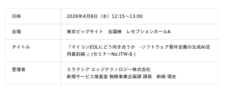 ミラクシア エッジテクノロジー株式会社(本社:京都府長岡京市、代表取締役社長:中澤省吾)は、2026年4月8日(水)~10日(金)に東京ビッグサイトで開催される「Japan IT Week春カンファレンス」に登壇し、マイコンEOL(End of Life)対応における生成AI活用の最新動向を紹介します。