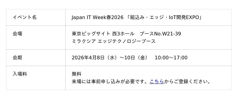 ■同時開催 Japan IT Week春2026「組込み・エッジ・IoT開発EXPO」にミラクシアブースを出展
