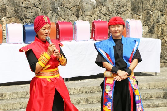 残波大獅子太鼓は、おきなわワールドでの公演が30年という節目を迎えたことを機に、これまで支えられてきた地域への感謝と、次代を担う子どもたちへの応援の気持ちを込めて、ランドセルの贈呈を行いました。