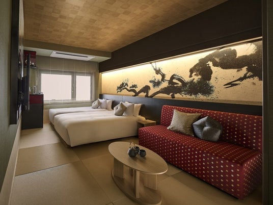 和の趣と洋の快適さを融合した畳敷きの和洋室。ホテル最上階、大浴場と同フロアにあり、湯上りもそのままくつろげます。水墨画家 與座 巧 氏が手掛けた“長寿の象徴”とされる「松」のアートが、心地よい和の雰囲気を演出します。
