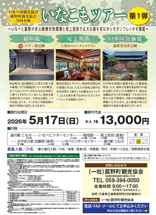 本ツアーでは、通常は完全非公開となっている貴重な邸宅を、所有者や管理者の案内とともに特別に見学いただけます 。稲垣邸(いなべ市阿下喜): 明治時代に造り酒屋として栄えた豪邸。現在も使用されている水路「マンボ」や、手入れの行き届いた二つのお庭を稲垣氏自らの案内で巡ります。