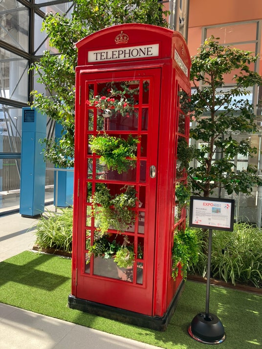 この赤い電話ボックスは、英国の街中で実際に使用されていたもので、万博会場ではアイビーなどの植物で装飾され、英国らしい美しいフォトスポットとして人気を集めました。