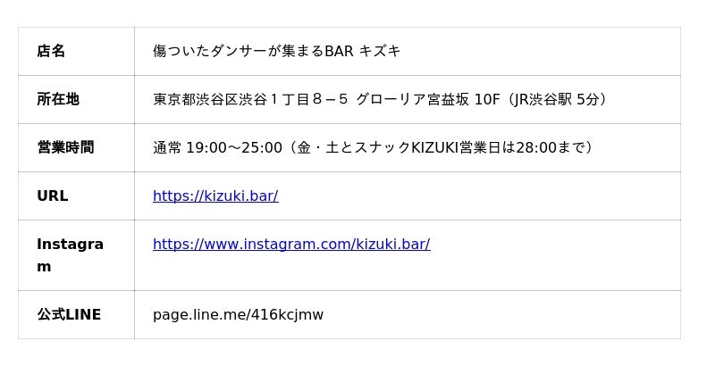 「傷ついたダンサーが集まるBAR キズキ」は、スタッフ全員が現役プロダンサーという異色のコンセプトを掲げるエンターテインメントBAR。通常営業ではバーとしてお酒と会話を楽しめるほか、月に複数回のダンスショーイベントやカラオケを楽しめる「スナックKIZUKI」を開催しています。