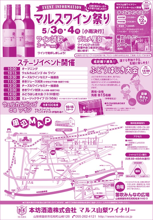 “ウェルカムビンゴdeワイン”、“チーズ&ワインセミナー”、“ぶどうはじき大会”といったイベントをはじめ、日本ワインコンクールをはじめとした各品評会で高い評価をいただいております「シャトーマルス・シリーズ」の試飲ができるコーナーを設ける等、大人から子供まで楽しめる盛りだくさんの内容で開催致します。期間中は、ワインにぴったりの料理やおつまみを提供すべく、地元山梨の飲食店さんにご協力いただき、グルメ屋台を設置いたします。お酒を飲める方も飲めない方も楽しんでいただけますので、ご家族揃って楽しくお過ごしいただけます。皆様お誘い合わせの上、ご来場ください。