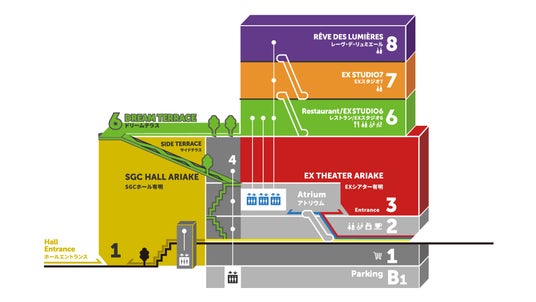 テレビ朝日のメディアシティ戦略の中核を担う複合型エンタテインメント施設。「全ての価値の源泉はコンテンツにある」という理念のもと、自社IPなどを活用したリアルイベントに加え、様々なパートナーの皆様と共に多様な展開ができる新たなプラットフォームとして誕生します。施設内には、多目的ホール・劇場・イベントスペース・屋上広場・レストラン・スタジオなどを備え、エンタテインメントとテクノロジーが融合する発信拠点を目指します。