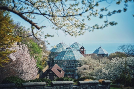 山桜とガラス張りのドーム「グラスハウス(温室)」