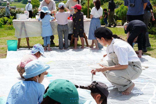 大きな絵を描くワークショップ絵本作家・小林由季氏と一緒に、自然の中で大きな透明ビニールに絵の具で絵を描くワークショップ。※事前予約制となります。
