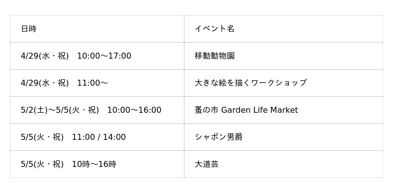 他にも、移動動物園や幻想的なシャボン玉の大道芸、キッチンカーなど、ゴールデンウイークを家族で満喫できる多彩なコンテンツをご用意しました。