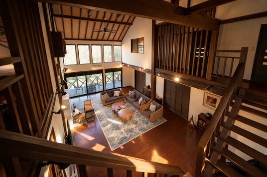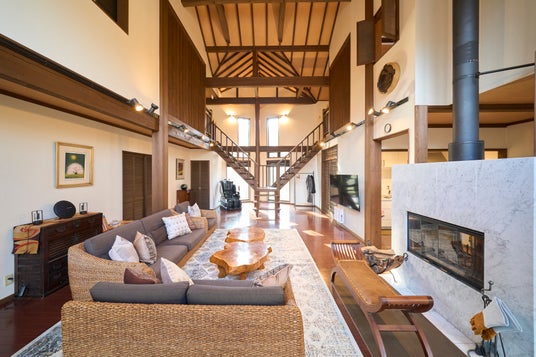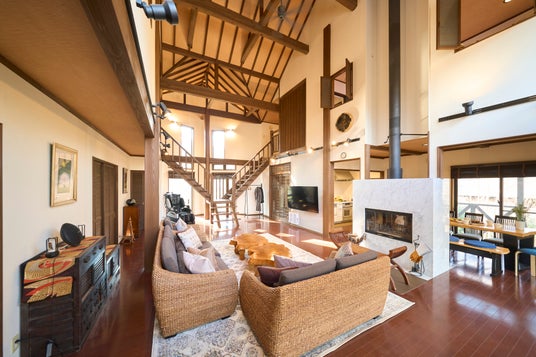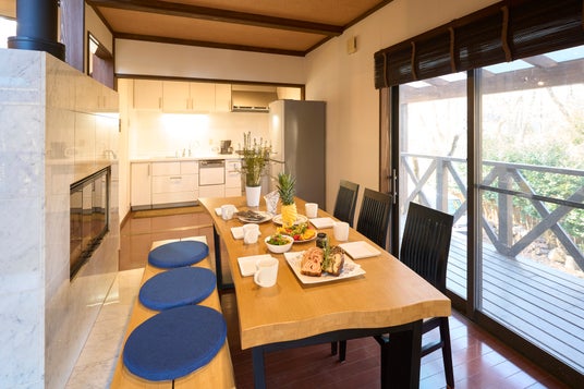 最大の特徴となる『ウッドデッキ』では、広大な自然の眺めと小川のせせらぎの音色が楽しめ、備え付けのグリル(電気式)による開放的なBBQや川遊び、星空観賞など四季折々の那須の魅力が満喫いただけます。2階建て4LDK(195.62平方メートル )の室内には、約8メートルの吹き抜けリビングが広がり、こだわりのインテリアがリゾートらしい上質なくつろぎの空間を演出、冬季には薪ストーブが利用可能で炎のぬくもりがやすらぎを提供します。
