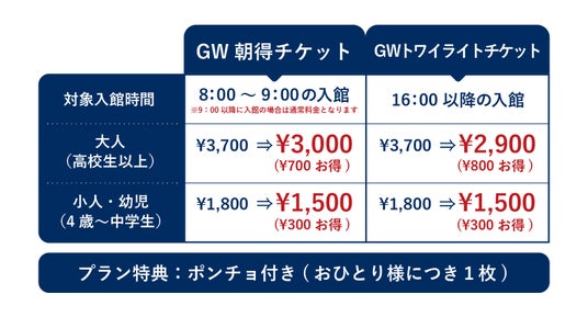 神戸須磨シーワールドではゴールデンウィーク期間中、日中の混雑を避けてお客様に快適に館内をお楽しみいただけるように、お得な「GW 朝得チケット」と「GW トワイライトチケット」の販売を開始いたします。どちらのチケットもオルカパフォーマンスやドルフィンパフォーマンスの観覧時にお使いいただけるポンチョの特典付きです。