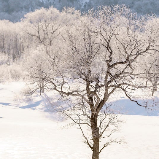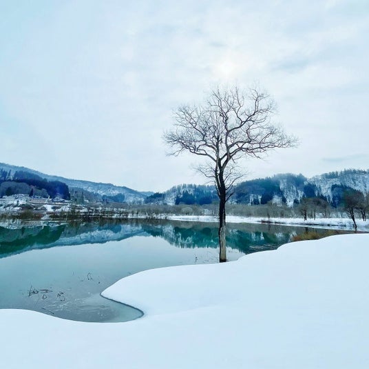さらに、3月下旬~4月中旬、木々が芽吹く前の水没林は、湖岸の残雪とともに白に包まれる静寂の世界に。この季節は「白の水没林」。水面に映る空の青さや、残雪の山のシルエットが美しく、新緑の季節とはひと味違う凛とした絶景が広がります。
