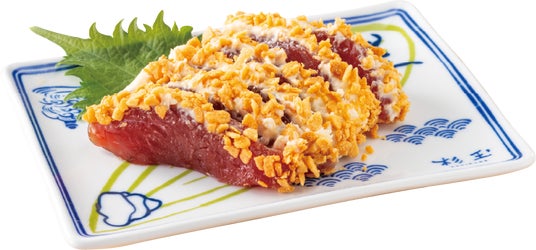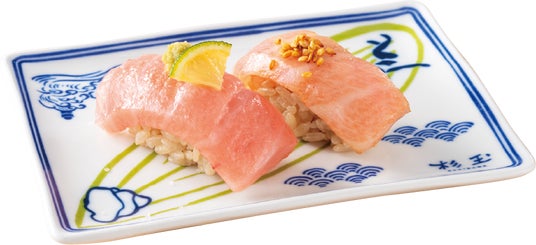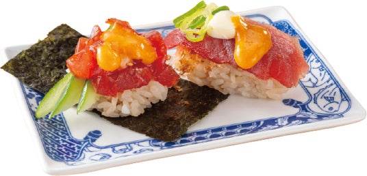また、濃い色味と旨みが特長の7kg以上の大ぶりなかつおを使用した商品が登場します。「かつお卵黄醤油 食べ比べ[2貫][ピリ辛ユッケ風・おかかマヨ]」はかつおの旨みを引き立てる2種類の味わいでご用意しました。ピリ辛のユッケだれで和えたかつおの包みと、ネタとしゃりの間に店内仕込のおかかをのせたにぎりに、特製の卵黄ソースをトッピングすることで濃厚な味わいを楽しめる一皿に仕上げました。
