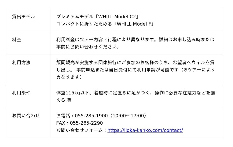 WHILL株式会社(本社:東京都品川区、代表取締役社長 CEO:杉江理、以下「WHILL社」)は、株式会社飯丘観光(本社:山梨県南アルプス市、代表取締役:秋山武弘、以下「飯丘観光」)が展開する貸切・観光バス事業に、免許不要で歩行領域を走れる近距離モビリティWHILL(ウィル)のレンタルサービスが4月から新たに登場することを発表いたします。飯丘観光は県唯一のリフト付き大型バスを保有するなど、同エリアでのアクセシブル・ツーリズムをいち早く推進しており、ウィルの導入もその一環です。バス降車後の目的地でも快適に移動できる体制を整えることで、年齢や障害、身体状況などに関わらず誰もが観光を満喫できる幅広い旅行体験を提案いたします。なお、本取り組みには、県内でウィル製品を取り扱う甲斐日産自動車株式会社(以下「甲斐日産」)も協力しています。