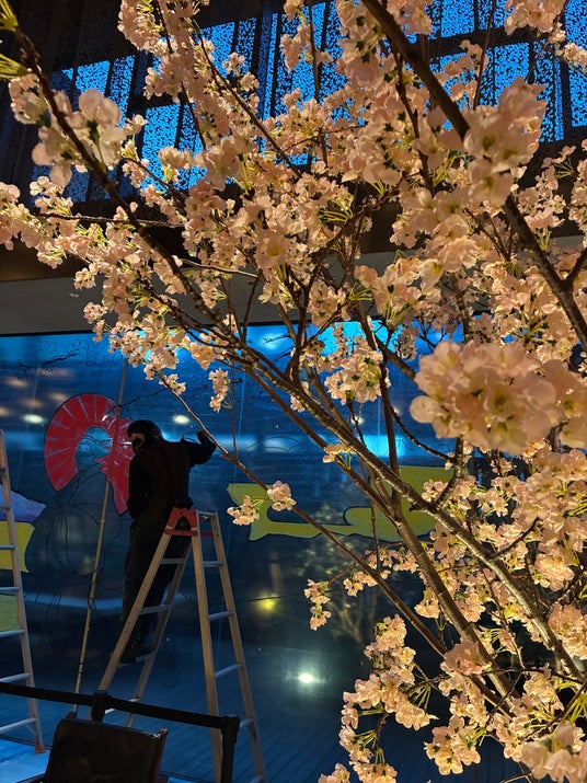 ロビーには、季節ごとに装いを変える華やかな桜の植栽がレイアウトされており、マツナガ氏が描く『爛漫 -Ranman-』と見事に調和しています。平面のアートと立体の植物が融合することで、ロビー全体が春のエネルギーに満ちた没入感のある空間へと昇華されました。