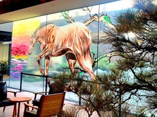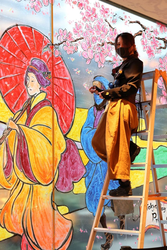 東京ベイ潮見プリンスホテルのエントランスロビーの窓に描かれた江戸の春をイメージした『爛漫-Ranman-』