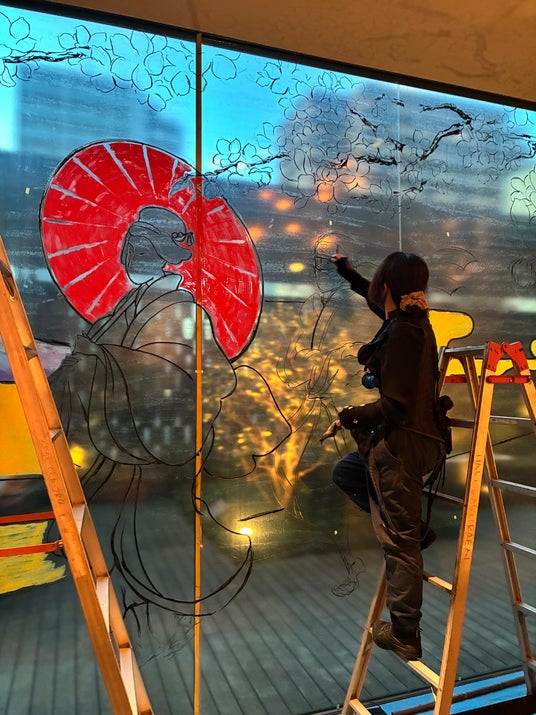 同ホテルで2025年に開始したキットパスウィンドウアートは今回で第4弾目。テーマを "江戸×TOKYOの春” とし、『爛漫 -Ranman-』のタイトルで描かれたのは、江戸の粋を感じさせる富士山と桜をダイナミックかつ繊細に表現したアート。アーティスト・マツナガマサエ氏が、春の訪れを告げるエネルギーを窓一面に描き出しました。