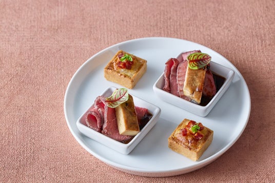 19世紀のイギリスで夕食の習慣として生まれた「ハイティー」。ストリングスホテル 名古屋の「ニューヨークラウンジ」では、この歴史ある食文化を、メイン料理やお酒にも合う現代のディナースタイルへとアレンジして提供いたします。窓の向こうに広がるライトアップされた大聖堂の景色を眺めながら、非日常の優雅な時間をお楽しみいただけます。お食事はグリンピースのムースとトマトジュレの鮮やかな二層にずわい蟹を乗せたヴェリーヌや、花びらを衣でまとわせたモッツァレラと生ハムのフラワーフリット、ピクルスにした紅しぐれ大根で桜鯛とタルタルソースを包みキャビアを添えた一品、強い甘みが特徴の最高品質「天使海老」のマリネ、芳醇なトリュフソースが香る北海道しほろ牛とフォアグラのロッシーニなど、贅を尽くした品々をご用意。世界三大珍味を取り入れた特製セイボリー8種類、季節のスイーツ2種類とフルーツの盛り合わせをお召し上がりいただけます。また、メインディッシュとして別皿でご用意するのは、厳選した和牛の脛肉をじっくりと柔らかく煮込んだシェフ渾身の一皿。充実したセイボリーとともに、本格的なディナーとしての満足感をご堪能いただけます。