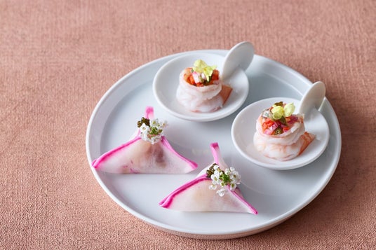 2段目:オシェトラキャビアと桜鯛のラビオリ仕立て/天使海老のマリネ ラヴィゴットソース