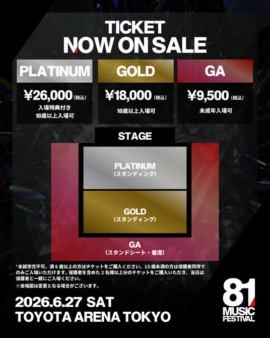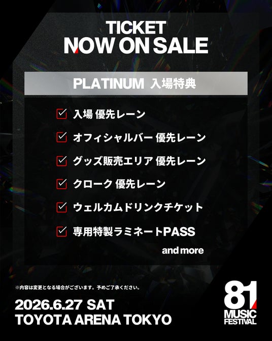 81 MUSIC FESTIVAL 製作委員会(以下、当委員会)は、2026年6月27日(土)、東京・お台場のTOYOTA ARENA TOKYOにて、新たな音楽フェスティバル「81 MUSIC FESTIVAL(エイティーワン ミュージック フェスティバル)」を開催いたします。